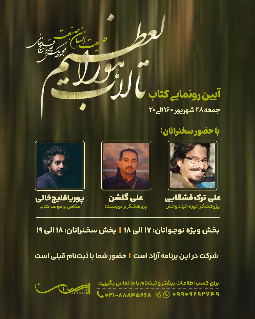 این نشست با حضور نویسنده کتاب‌ « تالاب هورالعظیم »، پوریا قلیچ‌خانی، کارشناس ارشد تنوع زیستی، مولف، برنامه‌ ساز و عکاس،علی گلشن، پژوهشگر و نویسنده، علی ترک‌قشقایی، پژوهشگر حوزه حیات‌وحش، در موسسه ابرسین، برگزار می‌شود. این کتاب که حاصل یک سال و نیم تلاش مستمر و پژوهش میدانی پوریا قلیچ خانی در دو بخش ایرانی و عراقی تالاب است که به سه جنبه کلیدی این زیست‌بوم ، فرهنگ جامعه تالاب‌نشین و تأثیرحضور صنعت می‌پردازد.